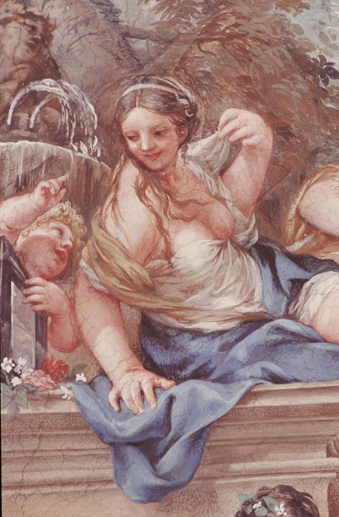 In 1640, Cortona worked on the Palazzo Pitti Frescos with the painter Ciro Ferri (1634-1689), who finished quite a bit of the frescos after Cortona’s departure. In fact, most agreed that Ferri had copied the master’s style so perfectly there could be no distinction as to what section each had taken on.[10] Part of the Sala di Venere ceiling features this detail of a Lady in Blue. (figure below) Behind her, is a waterfall which shares a similar brushwork to the fountain in our Esther.[11]