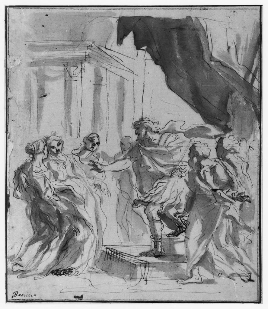 [18] Giovanni Battista Gaulli. Esther before Ahasuerus. c. 1665. Pen and brown ink with brown wash over indications in black chalk on pale buff paper, 25.6 x 21.8 cm. Ashmolean Museum, Oxford, England; Purchased (Old Master Drawings Fund), 1960. https://jstor.org/stable/community.14543877.
