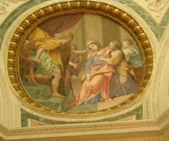 The closest compositionally to our Esther is a fresco by Domenico Zampieri, better known as Domenichino. Around 1628, Domenichino was commissioned to paint frescos in the church San Silvestro al Quirinale in Rome. In the Cappella Bandini he painted four ovals. The four subjects of these ovals are David with a harp, Judith with the head of Holofernes, Solomon and Bathsheba and Esther before Ahasuerus (figure below). [3] An author, Luigi Serra wrote a monograph of Domenichino’s work in 1909.[4] In it Serra mentioned the oval in Cappella Bandini and in his foot notes comments: