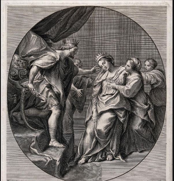 In 1643, Cortona painted Caesar leads Cleopatra to the Throne of Egypt, which shares a lot with our Esther. (figure below) [12] Ahasuerus (the king on the left) and Caesar share the same Roman outfit. The thrones share the same lion headed armrest. Also, in my opinion several other elements of the painting are reminiscent of our Esther. Both Caesar and Cleopatra, and the ceiling of the Pitti Palace might suggest a 1640’s date to our composition.