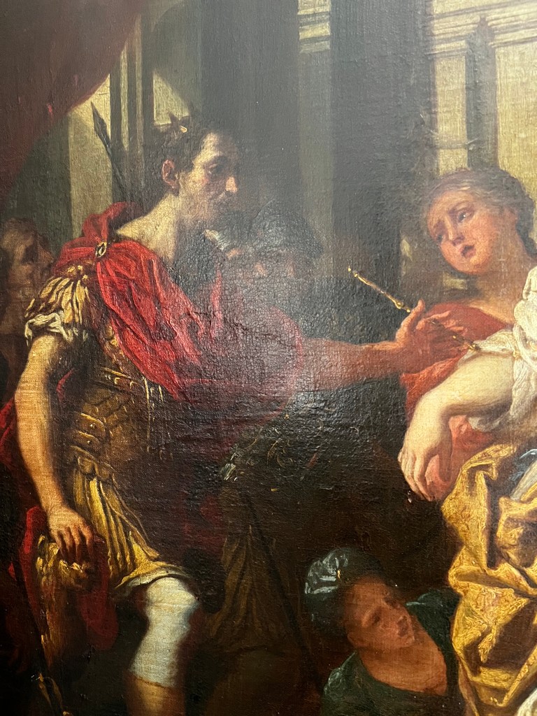 Veronese was a Venetian painter, who died in 1588, almost a century prior to the suggested dates of our Esther. First, we are not 100% sure of the date of our Esther. However, even a date of 1588 is very unlikely based on style. It most likely belongs to the 1660’s era of Baroque Italian style. The biggest, and perhaps only, suggestion that it might be by Veronese is the graphite inscription on the stretcher that was recently uncovered with Ultraviolet light. [1] It could be in the school of Veronese, a pupil of his or a student copying his works and eventually got mislabeled. However, it is pretty unlikely that it was painted by him. It is more likely that some in the 18th or 19th century thought it was by him or wanted to sell it as a Veronese and inscribed the name on the stretcher.