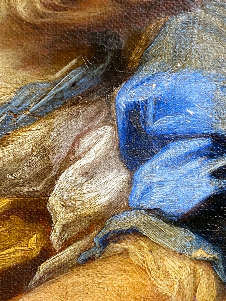 Color wise, our Esther painting does contain a beautiful Venetian blue, which promises to pop when it is fully cleaned. Here is the cleaning test (figure below). Veronese, being from Venice, used this beautiful tone of blue frequently in his works. One thing missing from our Esther, which might have indicated Veronese as the painter, is the Venetian green, which Veronese frequently used. However, the Venetian green is lacking from the painting.