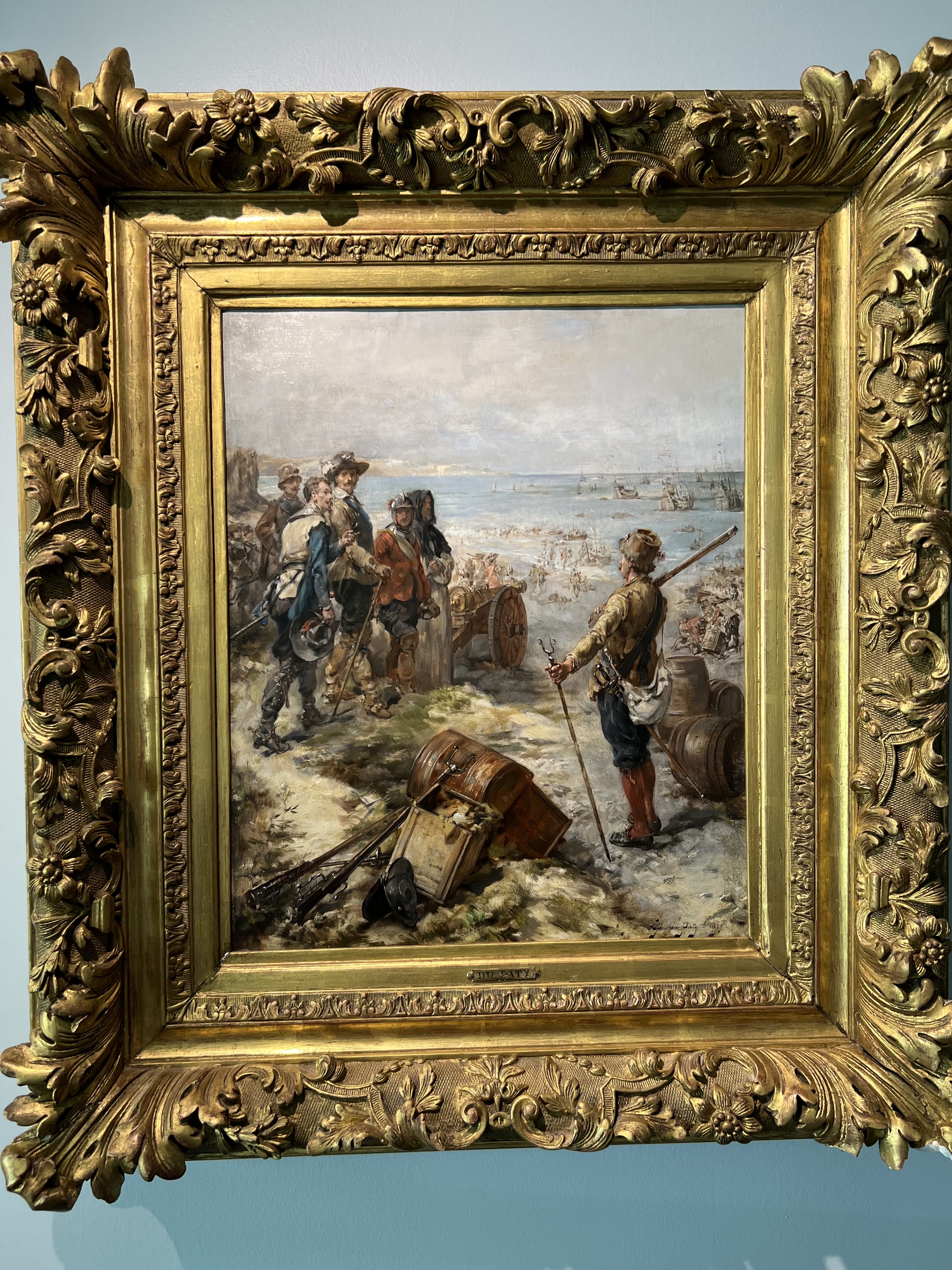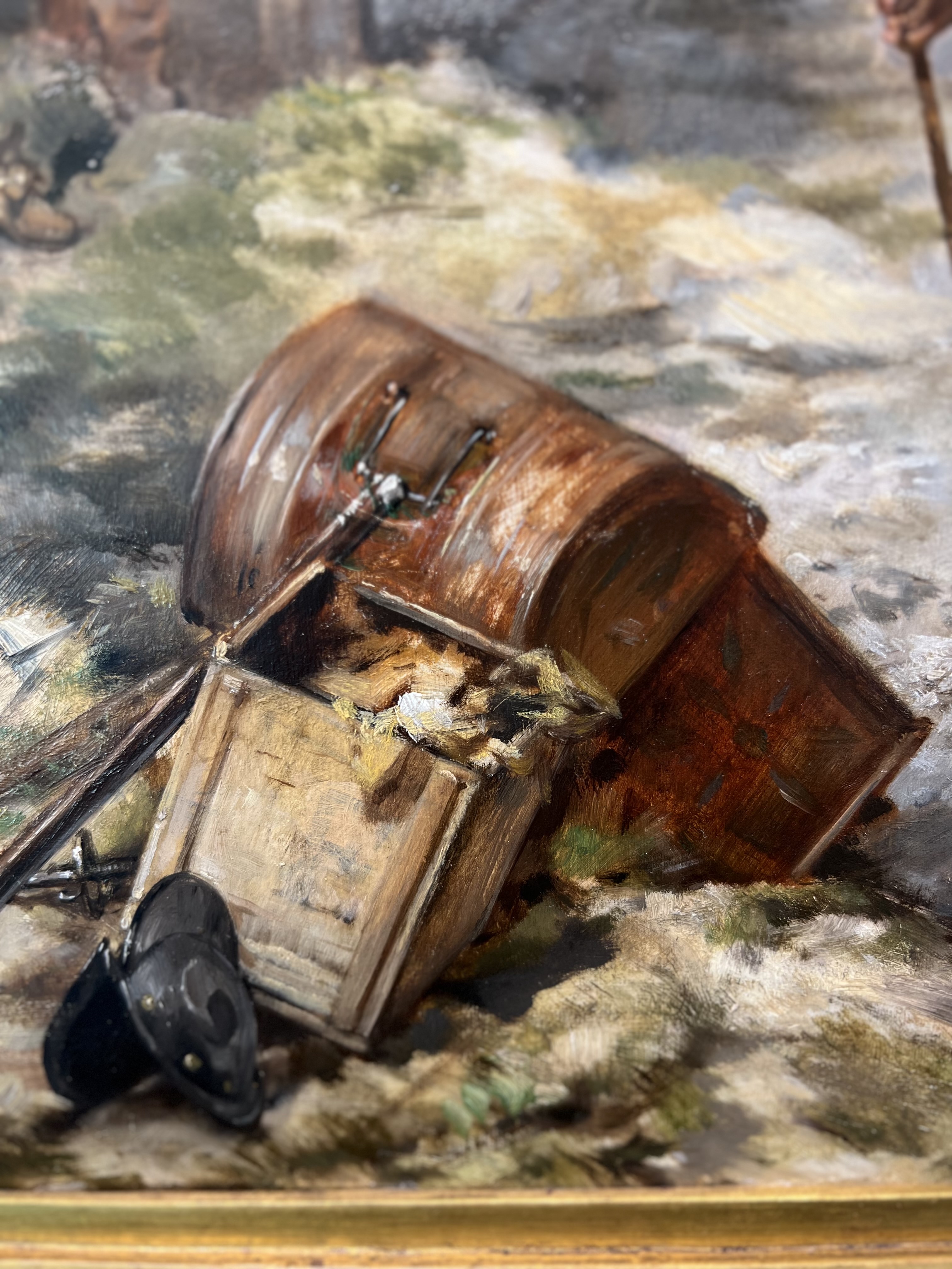 Du Paty painted this work, known as L’Embarquement en 1627, in 1879. That year it was exhibited at the Parisian Salon. The oil on cradled board measures 27 ¼” x 24” in its gilt frame, which previous owners claimed to be the original frame. It is signed and dated in the left corner: Leon du Paty 1879.
