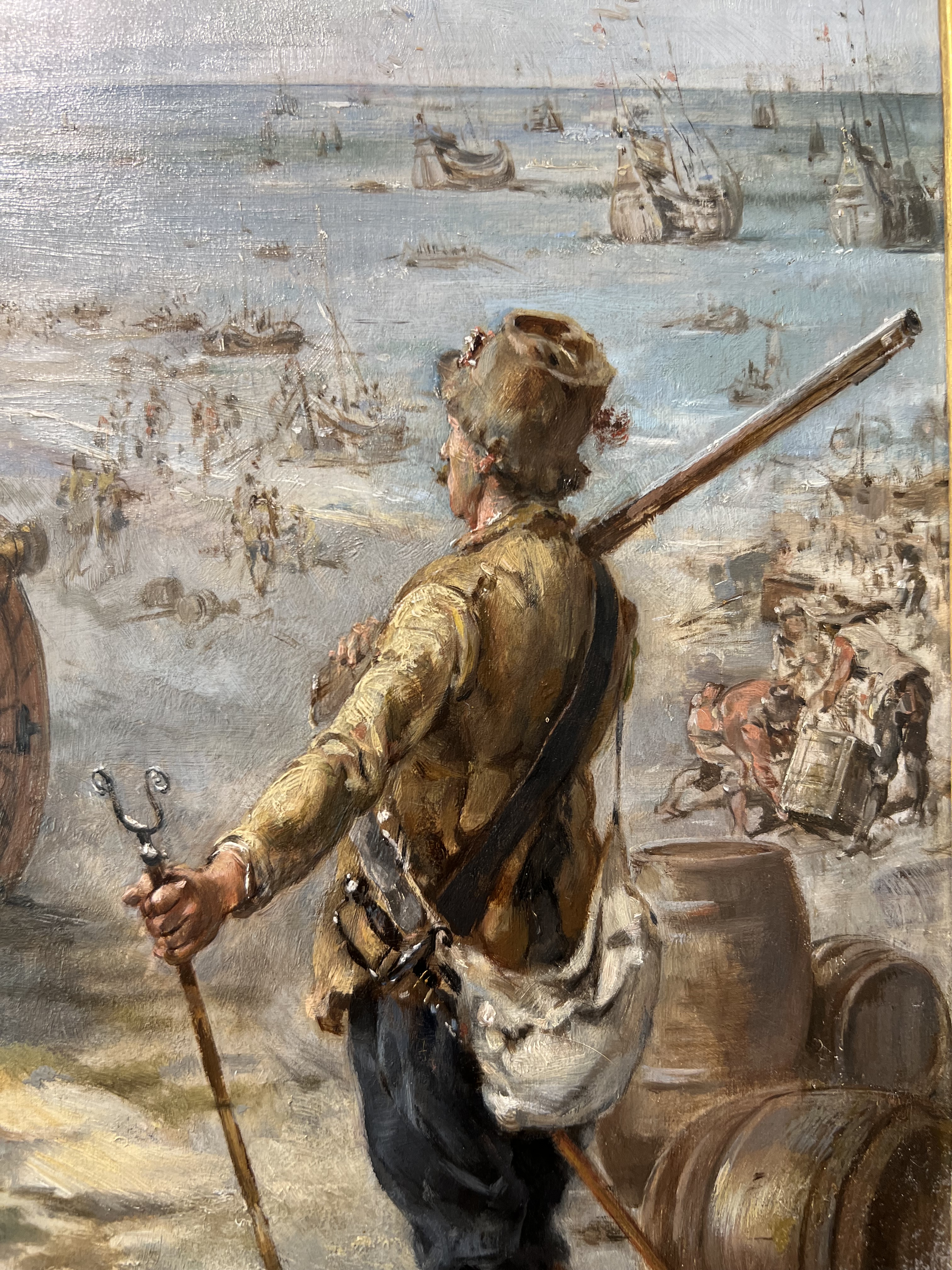 In 1627, a war broke out between French forces under the control of Louis XIII and the Huguenots of La Rochelle. The French siege of La Rochelle resulted in victory for the Catholic king and loss for the Protestants. Now we know that du Paty painted a scene of the battle earlier in 1869.[12] However, given the title, this scene might represent the French troops embarking on a marine battle of some sort, potentially La Rochelle. In fact, the French Régiment de La Marine was founded in 1627.