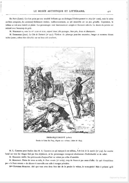 In 1879, our painting was exhibited at the Paris Salon. Numbered as 1100 and titled L’Embarquement en 1627.