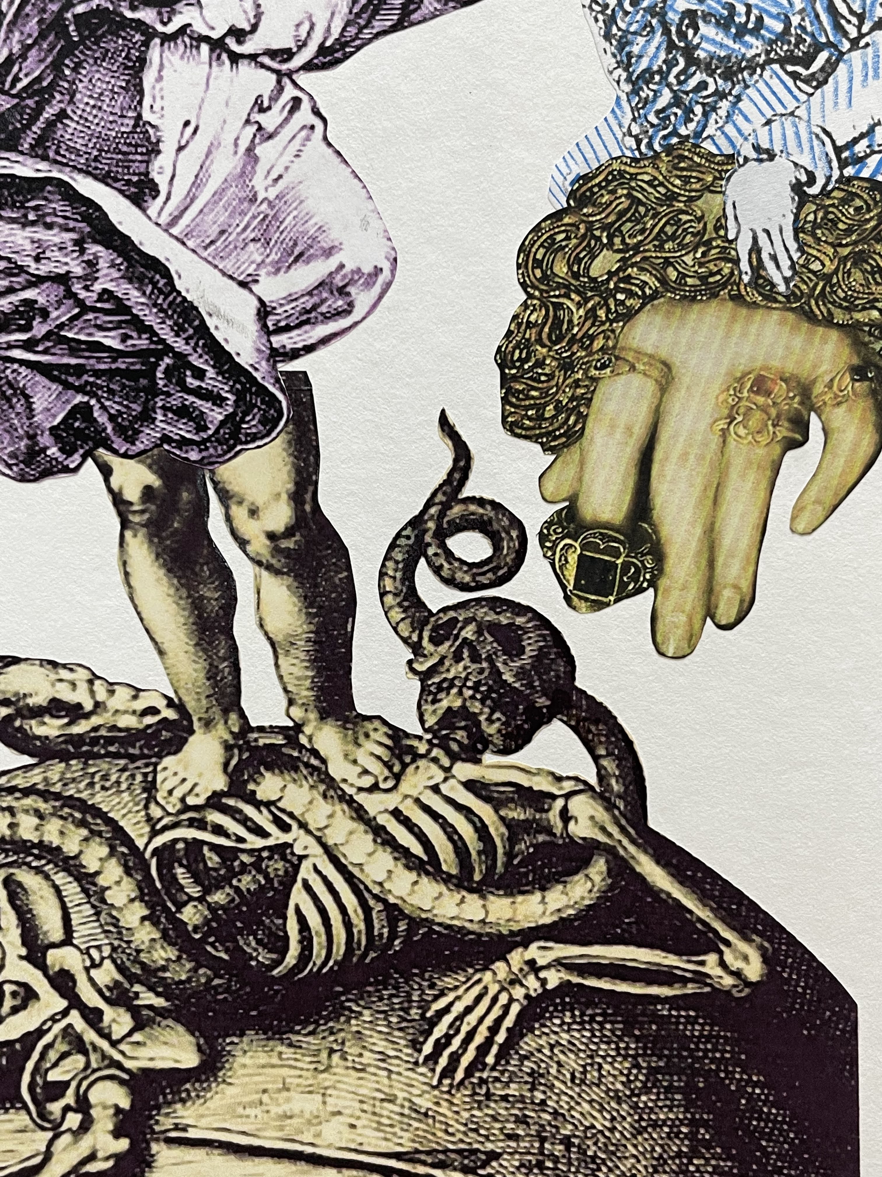 To create his aluminum prints, Philip first starts with creating hand cut collages. A process he enjoys due to its meditative nature. Then, he takes those collages, blows them up and prints them on aluminum. Finally, he paints, collages and adds paper to the collages to create a final image.