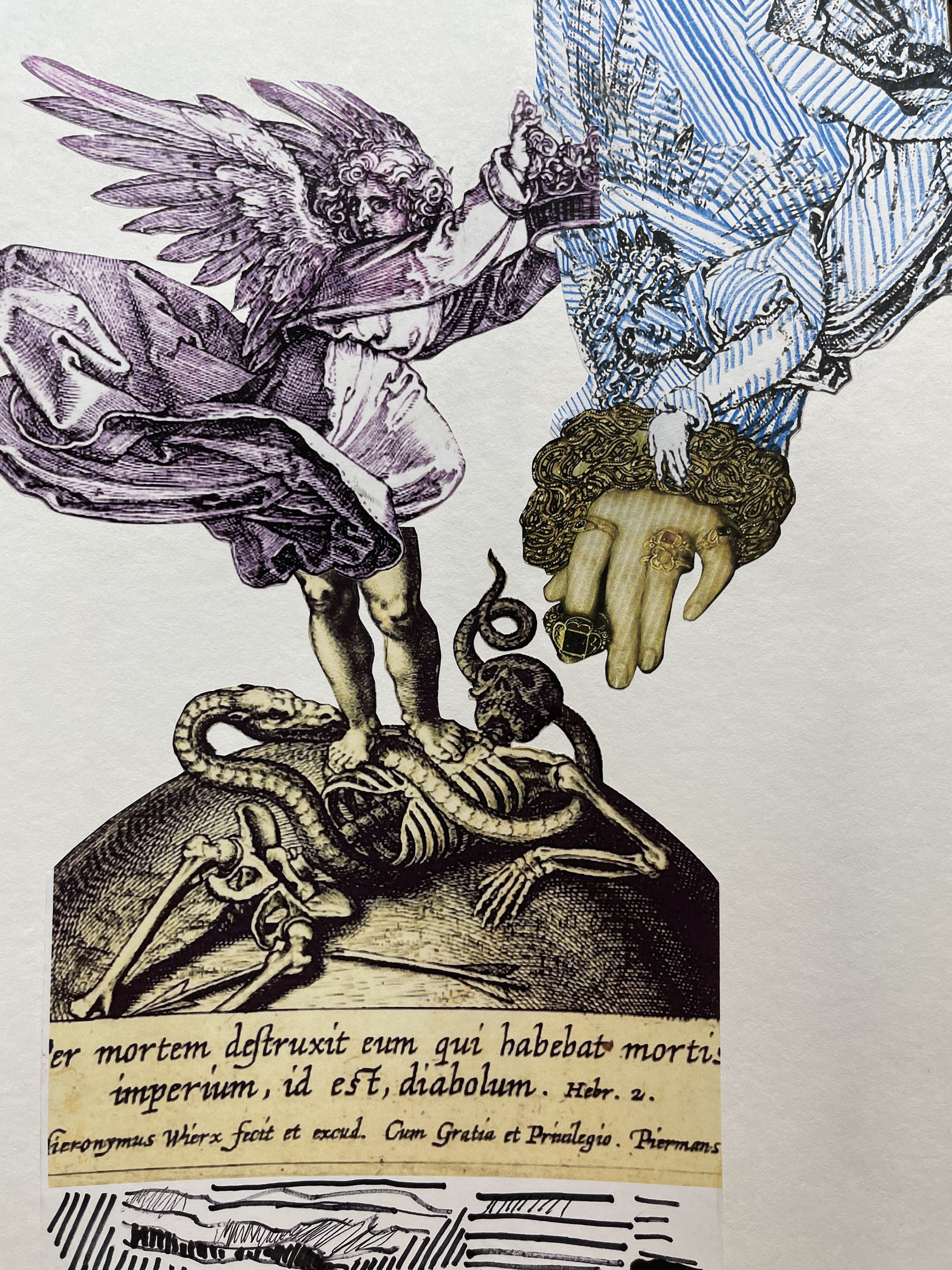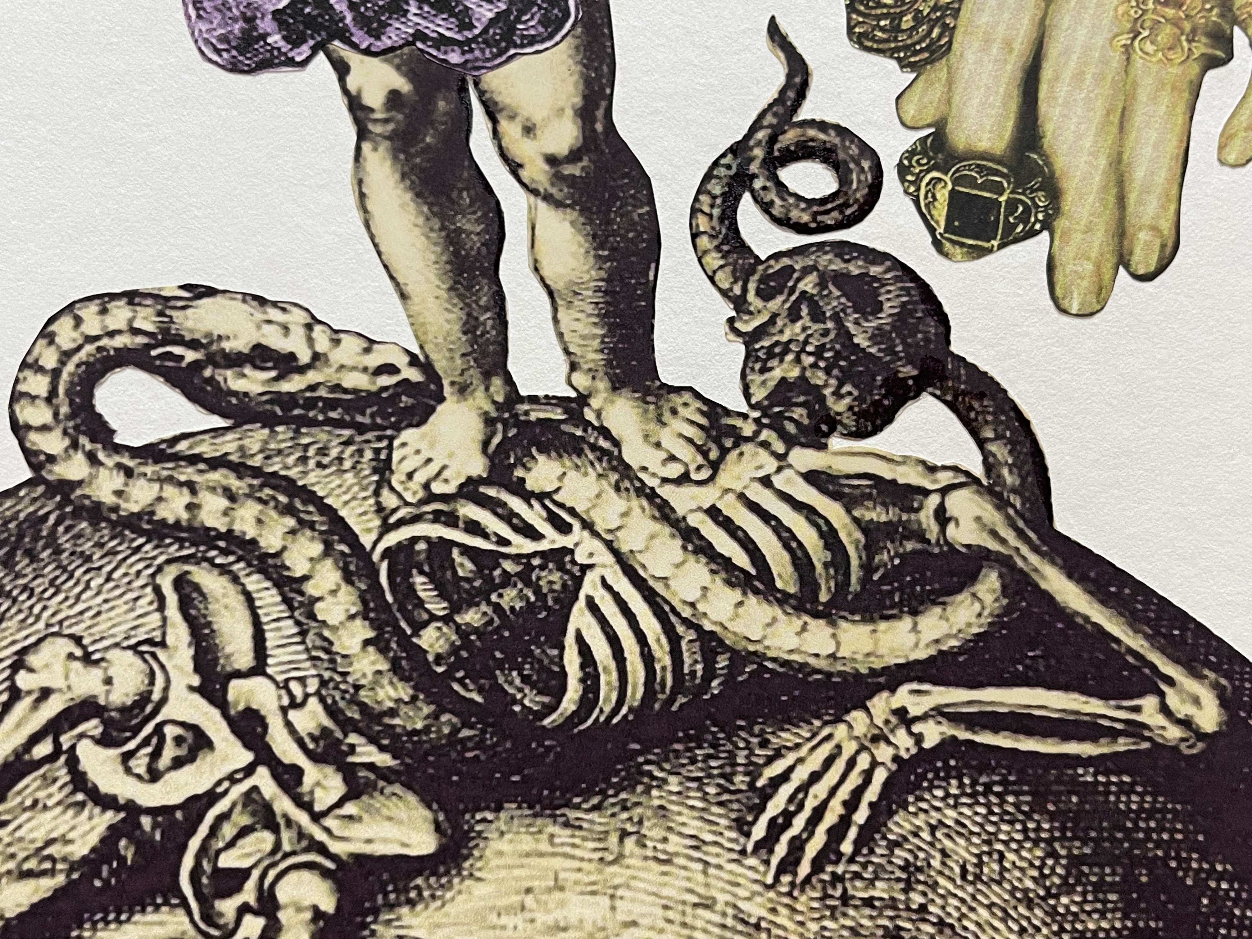The Middle Way Triptych was created by photographing and manipulating hand-cut collages and mounting the photographs on aluminum panels. The multi-step creation process begins with Lawson cutting out each piece by hand to create traditional collages on paper. After blowing up the collages and mounting them on aluminum, Lawson further alters the images by painting and decoupaging the panels. The meditative nature of cutting each element out by hand is appealing to Lawson. Lawson creates unpredictably, without preplanning, allowing the art itself to dictate what symbols and narratives appear. In this case, the panels were created separately. However, when placed together in a triptych, a theme was revealed.